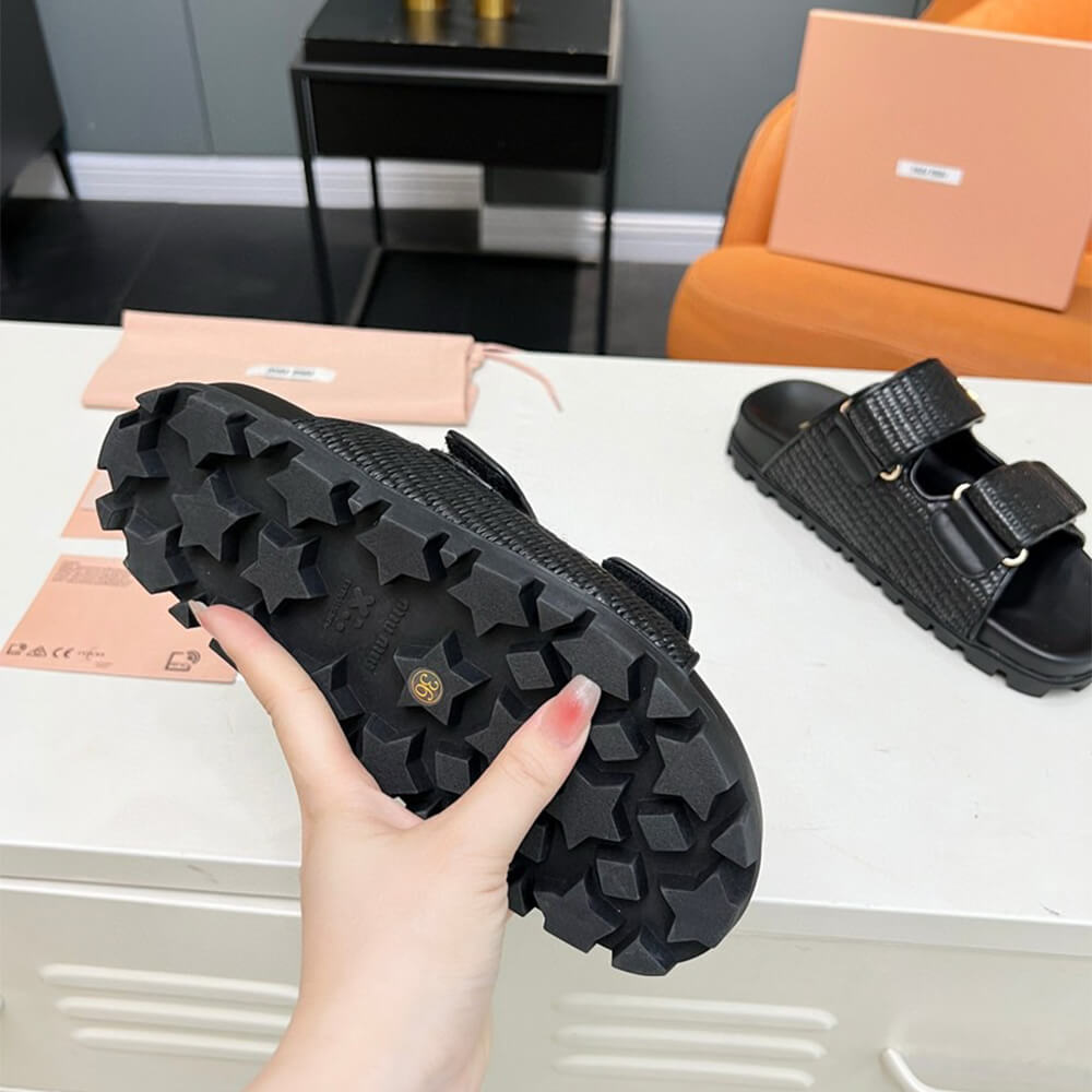 MiuMiu Raffia-effect woven fabric slides